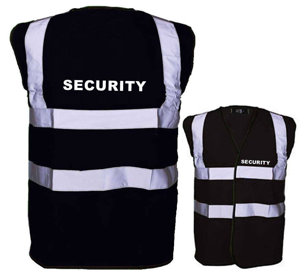 This is a black safety vest with reflective strips on the shoulders and chest. It features a “SECURITY” print option for the front, back, or both. The vest has hook and loop fastening at the front. It is available in sizes Small (38″), Medium (42″), Large (46″), XL (50″), XXL (54″), and 3XL (58″).