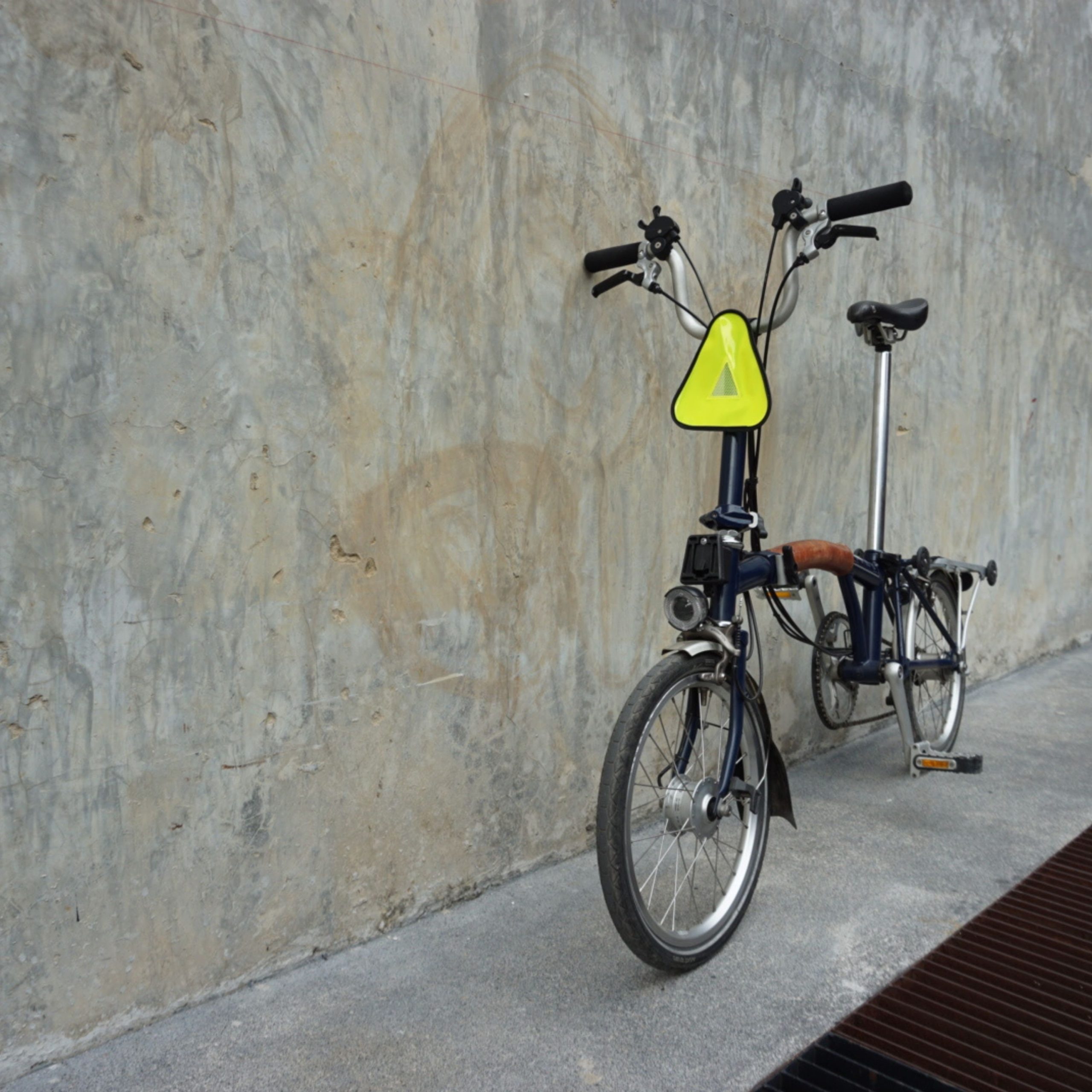 This is a high-visibility reflective accessory designed for use in low-light conditions. It features thick reflective bands to increase visibility. The accessory can be attached to bicycles, backpacks, scooter handles, wheelchairs, strollers, and other slow-moving vehicles. It is secured with hook and loop straps and can be attached to various points on a bicycle. The reflective symbol remains visible when wet. The accessory is weatherproof and constructed from durable materials. It is available in yellow, pink, and orange.